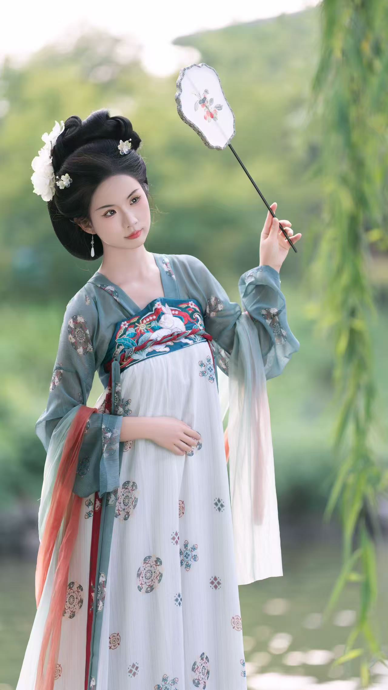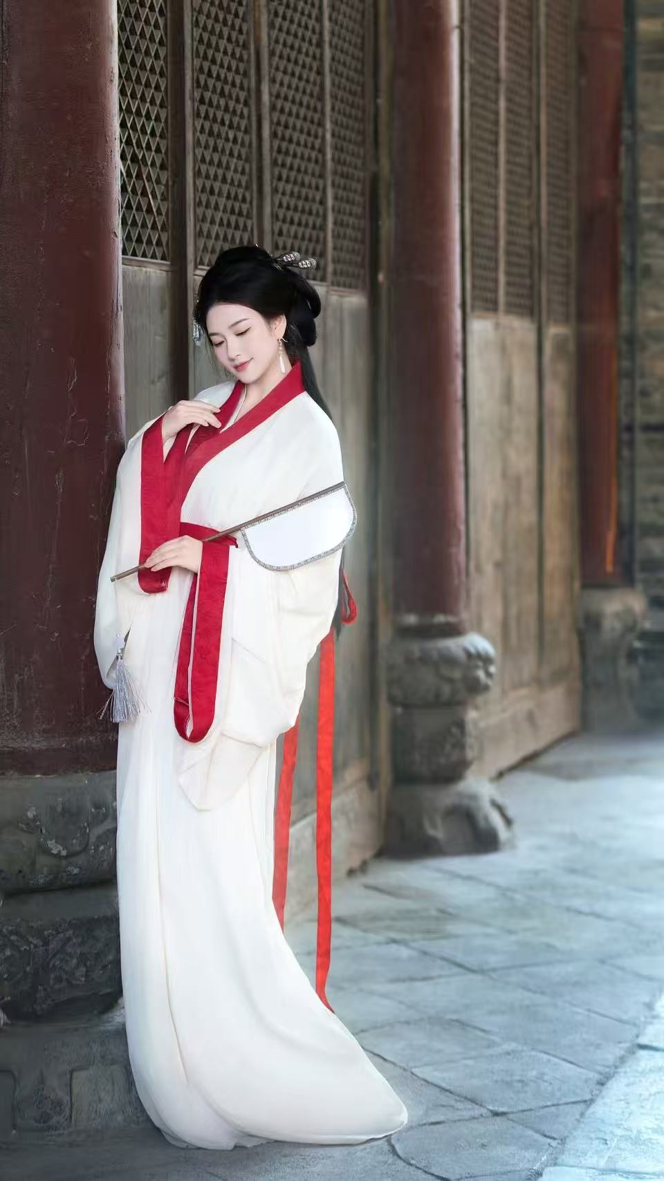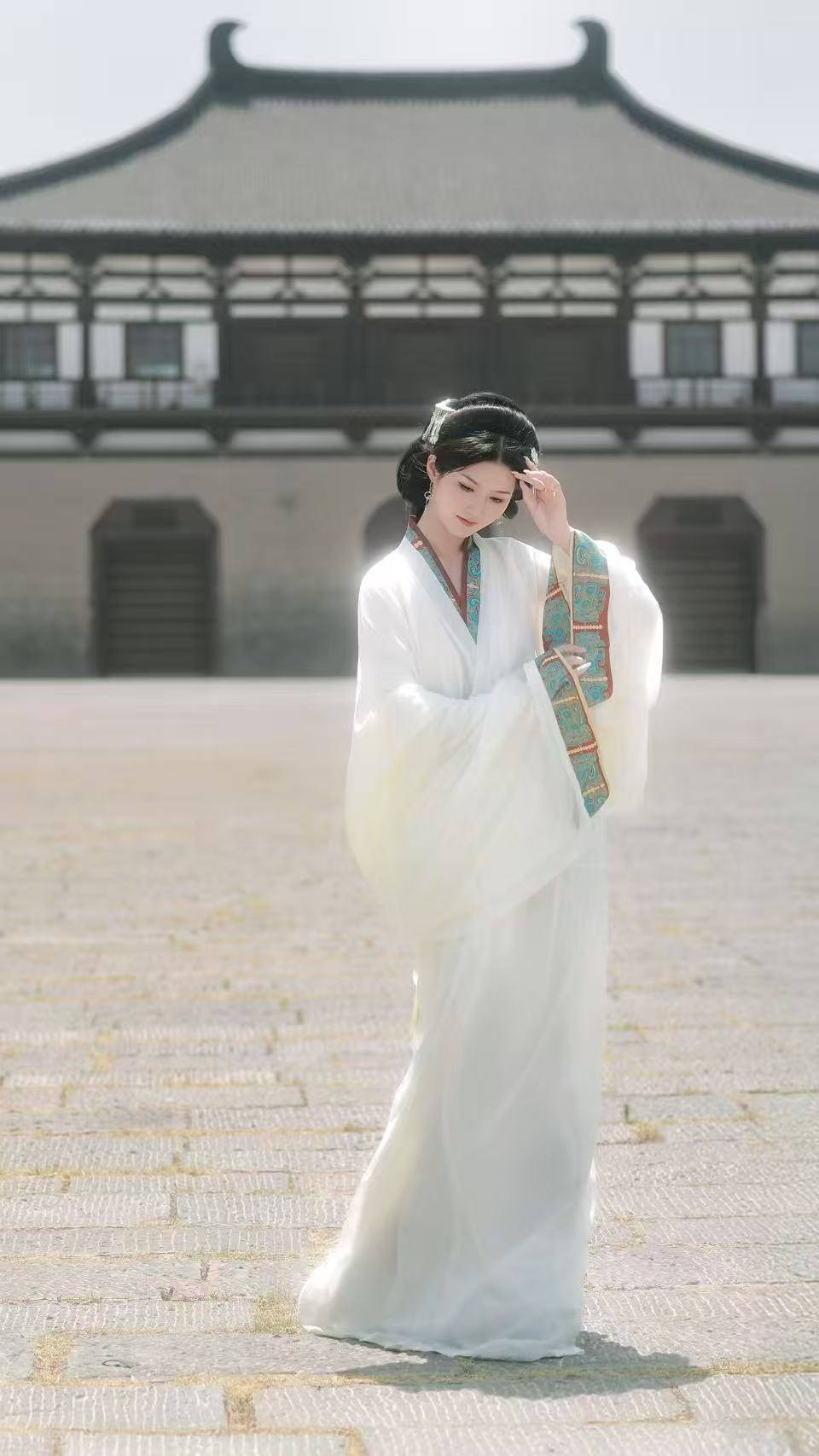 孔繁杰镜头下的美女,身着曲裾深衣的现代仕女,立于青砖黛瓦前,广袖垂云、腰封缀玉,织锦纹样间暗藏玄鸟图腾。这不是影楼常见的清雅汉服造型。而是一场对战国袍服的大胆复原——三重衣襟碰撞文化挑战。