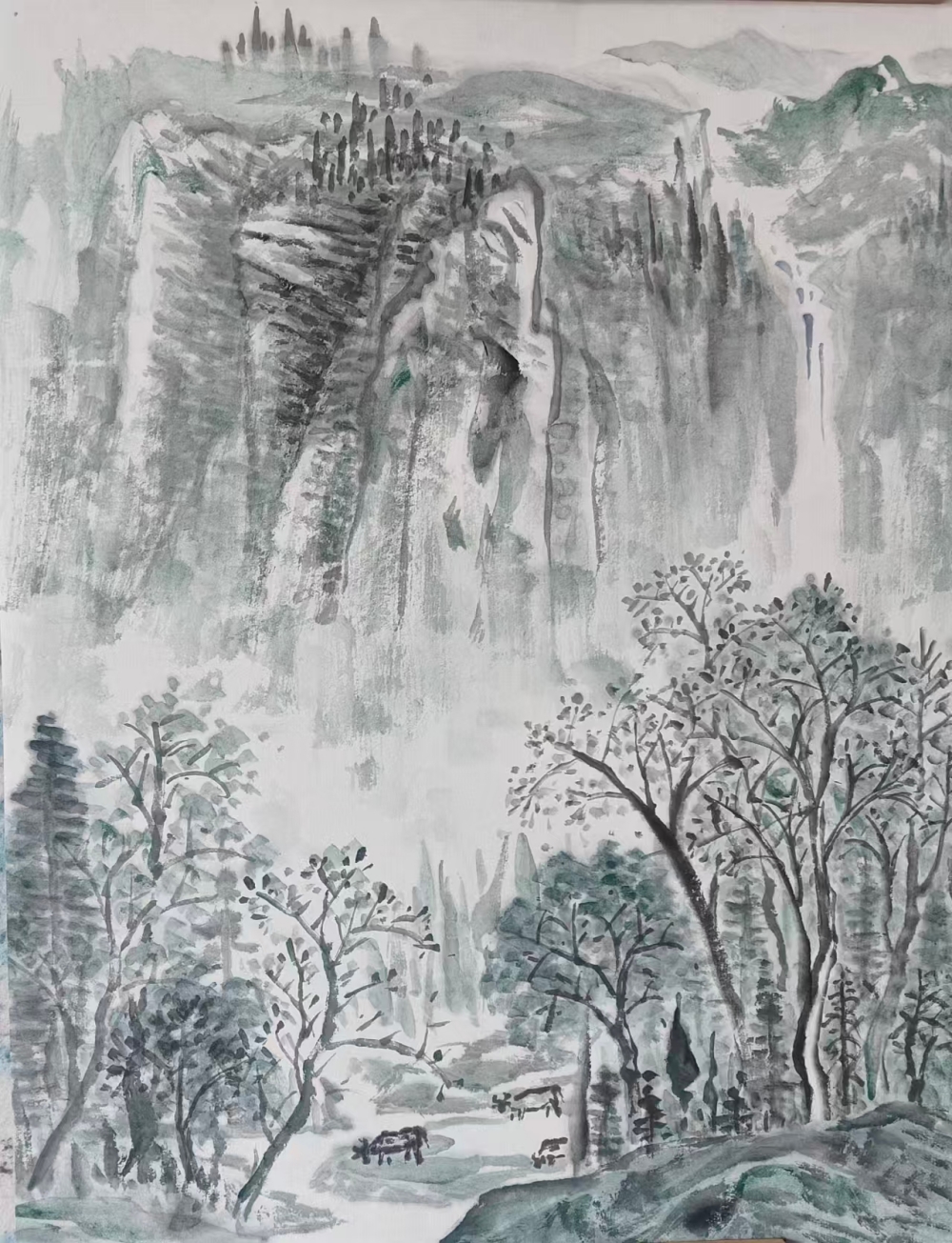 温斌的艺术启蒙根植于新疆广袤的土地。天山雪峰的巍峨、伊犁河谷的丰饶、边境生活的多样性,构成了他最初的美学记忆库。然而,他并未止步于地域性的视觉再现,而是远赴清华美院山水画高研班,系统研习祁恩进、朱零、张津诚等名家的笔墨语言与构图理念。这一教育经历使他获得了双重视野:一方面是边疆生活经验赋予的鲜活素材与情感连接,另一方面是传统山水画体系提供的技法支撑与美学框架。这种双重性使他能够超越简单的“地方风情画”,进入更为深刻的在地性美学建构。