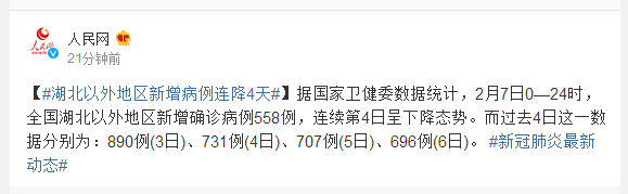 据国家卫健委数据统计,2月7日0—24时,全国湖北以外地区新增确诊病例558例,连续第4日呈下降态势。而过去4日这一数据分别为:890例(3日)、731例(4日)、707例(5日)、696例(6日)。