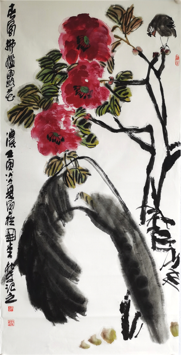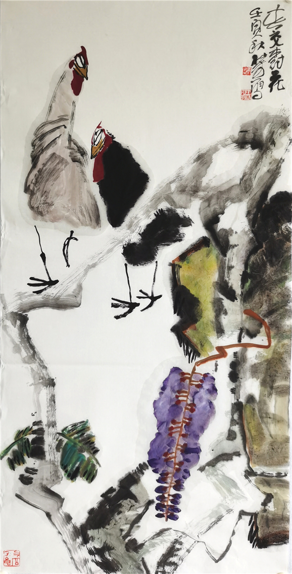 【中网资讯书画】读杜未的大写意花鸟,有个非常深刻的印象,就是“写”。写意画,当然首先要强调一个“写”字,所以他的作品不是“绘”,不是“画”,不是“描”,更不是涂涂抹抹的加工制作,而是大刀阔斧的写,大气磅礴的写,疾风骤雨的写,气吞山河的写,狂草一般的“写”。对于杜未来说,不“写”,就无以传承正宗中国大写意精神;不“写”,无法将稍纵即逝的顿悟表现出来;不“写”,就不能够表现自己想表达的意念、意境、意气、意态和意趣。正如他自己所说,“我的画,写我的感情,他们全都来自于传统和生活。”因此,他的花鸟寓性情于法度之中,寄墨法以文心雅趣,笔之所至,意之所至,心随笔转,墨趣生发。古拙的线条,是他的“心电图”;皺、擦、点、染,是他的脉膊律动;而他精心构建的艺术图式,则是他想要表达的意义、意境、意气、意念或者意趣。