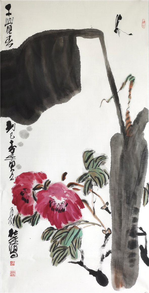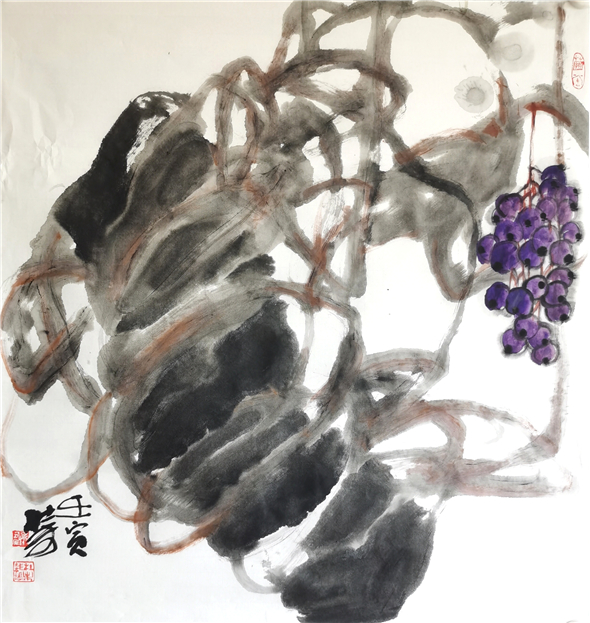 杜未近期简笔“写”出来的作品,比如《远瞩》、《凝香》、《多寿》、《古柏吟》、《寿喜图》、《花枝烂漫》、《芙蓉国里尽朝晖》等等,都是情之所至,一气呵成,一“写”而就,用笔老辣,结构严谨,形象夸张,构图洗练,寓意深刻。或者赋予作品一个美好意蕴,或者赋予作品一个灵魂,都有着非常明确的感情指向,表达了画家炽热的情感和强烈的人文情怀。这一“写”,写出了意态超迈,写出了古拙与疏简,写出了大气与超迈,写出了雄强与霸悍,写出了中国传统文化的韵味,写出了至刚至大的传统笔墨精神。“写”好画,需要书法功夫,需要骨法用笔,更需要传统文化做底蕴。大写意画,看似漫不经心,逸笔草草,实则法度森严,大有讲究。这里需要弄清楚一个概念,就是何为传统意义上的大写意花鸟?写意花鸟画一般分为小写意和大写意。小写意的特点是真实、生动,是花鸟中一种比较普遍的画法。而大写意是中国画里面一种难度较高、不易掌握的画法,需要有过硬的笔墨功夫,在表现对象时,往往带有很强的主观性,造型大胆、夸张,具有很强的抒情性、创造性和趣味性等特征,给人一种潇洒、气派、落落大方的艺术感受。一般说来,写意画着重于表现物象的神韵和画家的情致。当然,写实是写意的基础,写意是写实的升华。这里所说的升华,不是一般意义上的升华,而是基于美学范畴的诗意的、以简为尚的升华。而大写意之“写”,区别于西方绘画的“绘”与“画”,它是基于书画同源的笔墨精神,是以具有抽象性、韵律美和节奏感的书法艺术来写形、写境与抒情,是画家情感的诗意呈现。大写意之“意”,则是艺术作品所呈现出来的意念、意气、意境、意态和意趣。总之,写意画讲究的是“写”,讲究的是“意”,重视形似而不拘泥于形似,追求“不似之似”与“似与不似之间”,强调的是作者的个性发挥和“意气生发”。至于大写意的“大”,正如孟子所说,“充实之谓美,充实而有光辉之谓大”。它往往能表现出人格的伟大,心灵的伟大,以及集诗、书、画于一体的文化意义上的精深博大。读杜未大写意花鸟不难看出,他在追求至刚至大的传统美学精神的同时,赋予了作品传统文化的精髓,这才是更高级的绘画表现形式。其可贵之处在于用具象的花鸟、鱼虫、蔬果等生活中常见的题材,来表达自己独特的内心感受,以及关于人、轮回、生与死、幻像等玄而又玄的概念。画面上的具象,表达的恰是画家更为抽象的内心世界。