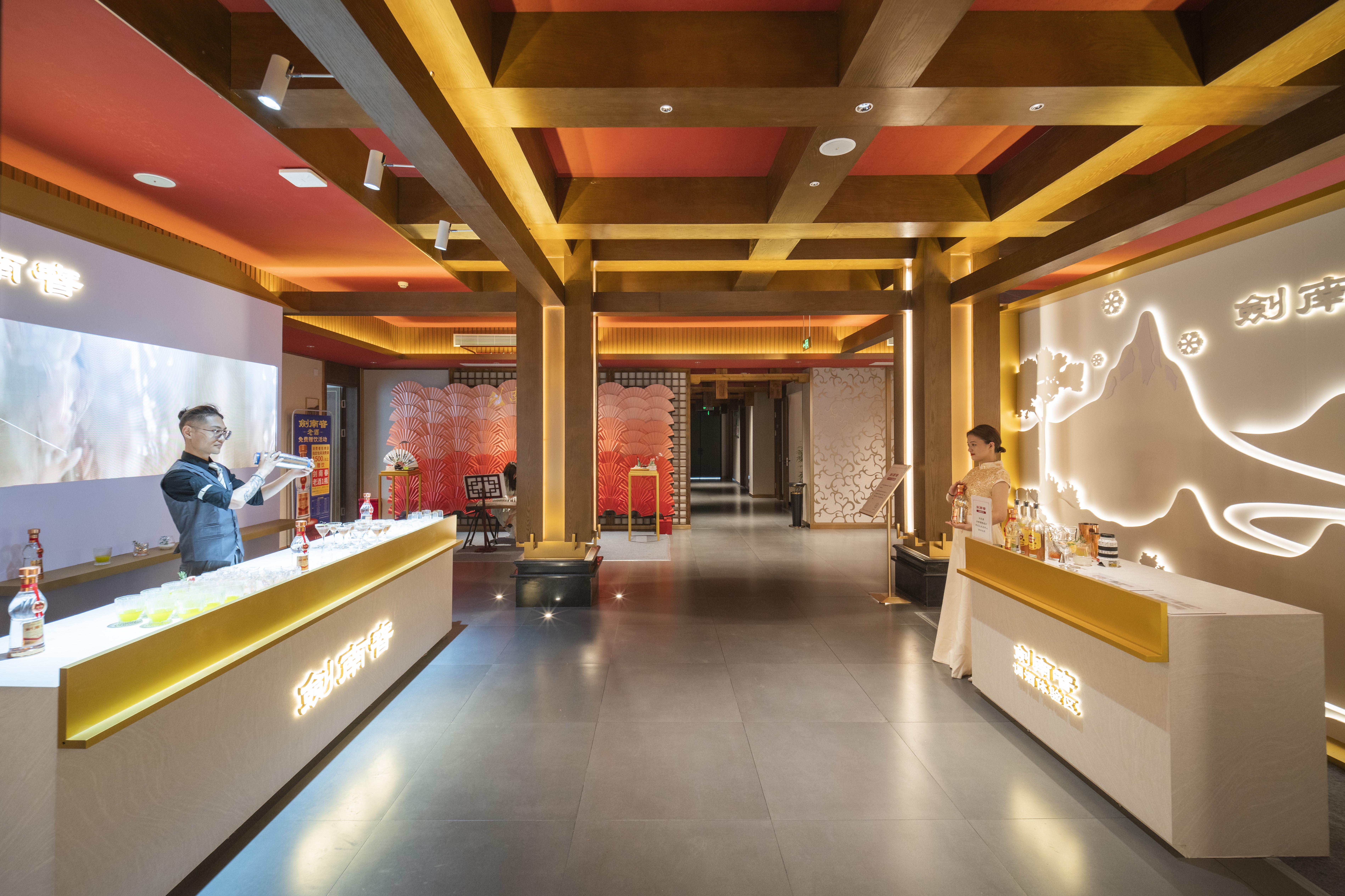 会场整体设计以唐宫风格为主,分为9个功能区,分别是接待引导台、时光门、文化形象墙、接待台、产品展示区、演艺区、调酒体验区、品鉴调酒区和鸡尾酒展示区,既传承了酒文化又穿插了演艺表演,沉浸式打造一场唐风酒会。